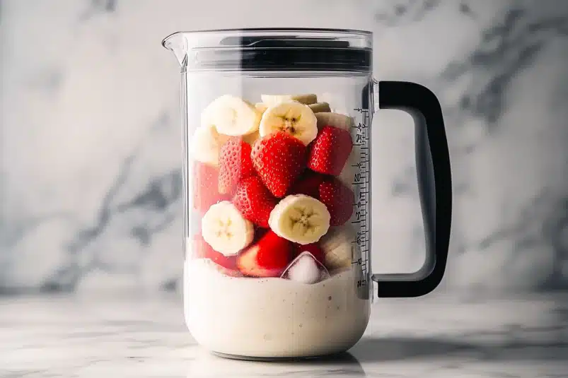 - Add ingredients – Start with milk and yogurt in a blender, then add the frozen strawberries, banana, and ice cubes.