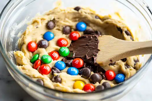 - Fold in chocolate chips and M&Ms – Don’t overmix!